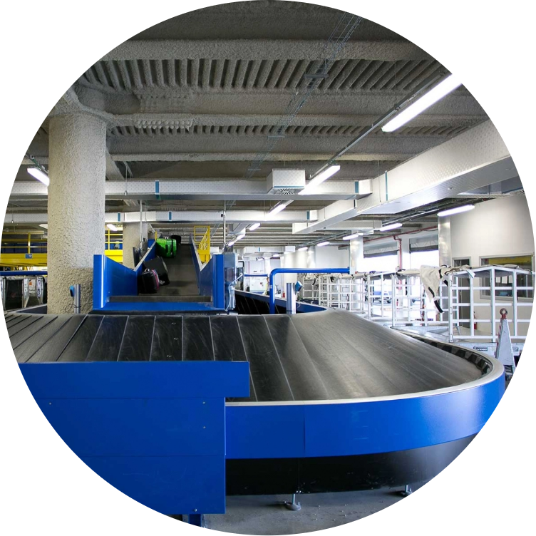 Cassioli’s inclined plate carousels can be used both in passenger baggage reclaim areas of the airport and in operational areas reserved for airport personnel. The system consists of a rigid closed-loop structure, some motorized modules and a track made of inclined plates on which the baggage is placed. The inclined plane configuration guarantees better visibility for passengers waiting for their baggage, better ergonomics, both during placement and removal of the luggage to and from the carousel and better alignment on the side nearest the operator (minimal effort to remove luggage). The inclined plate carousel occupies an area comparable to traditional flat plate carousels, but with a significantly higher load capacity.