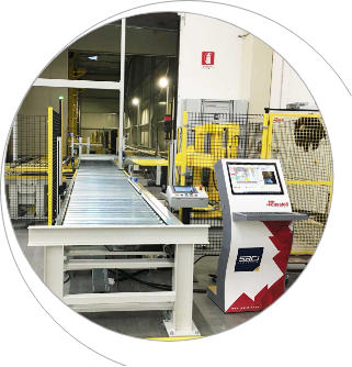 If the system identifies a pair of Düsseldorf pallets, the palletizer inserts a Europallet service pallet (1800x1200). The supply of service pallets on the line is ensured by an automatic stacker/destacker for service pallets. Before entering the warehouse, the unit load is analyzed again by a shape and weight control system: if appropriate, it is directed to the warehouse, otherwise it is moved to the reject station, where a client PC managed by the software Cassioli displays information about the anomaly found. Once arrived at the warehouse, the pallet is picked up by one of the ICRANE stacker cranes and positioned in the aisle chosen by the WMS management system through the ISAT pallet shuttle.