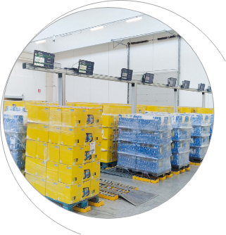 The entry and exit of goods from the warehouse takes place at level 0, through a handling system consisting of various types of automated conveyors. The incoming pallets (Europallet or coupled Düsseldorf pallet) are positioned through an hand pallet truck in the loading position: from here, they pass through a double control system that verifies the type of pallet and reads the bar code.