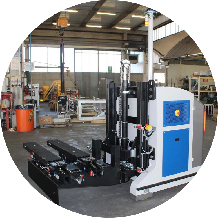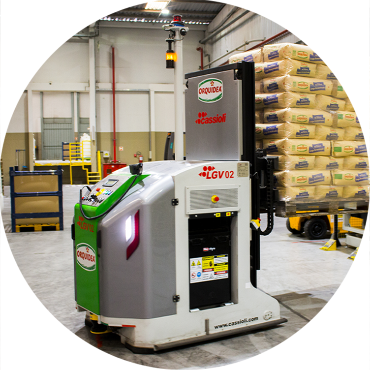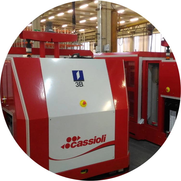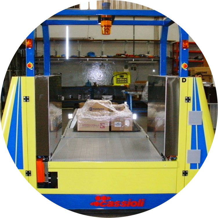 Cassioli’s Automated Guided Vehicle (AGV) is an extremely flexible solution for handling goods and an excellent alternative to conveyors and hand trucks. The AGV system guarantees full integration between the high-level information system used by the customer (Customer, Host, departmental system, SAP, etc.) and other management systems or devices, such as forklifts, robotic areas, palletizers, assembly lines and automated warehouses. Cassioli’s control system monitors all information relating to the positioning and status of AGV vehicles, as well as requests sent by the production system. This allows the system to perform real-time processing and determination of the most suitable route for the current situation (planning and routing of vehicles). Cassioli’s automatic AGV vehicles differ significantly in terms of weight and load size, single or multiple load, type of load and navigation system: Cassioli will develop the optimal solution, based on customer requirements, whatever the size and type of load to be handled. After analysing the dimensions, layout and environmental conditions of the system location, CASSIOLI technical personnel will decide whether a laser or natural navigation system is most appropriate.