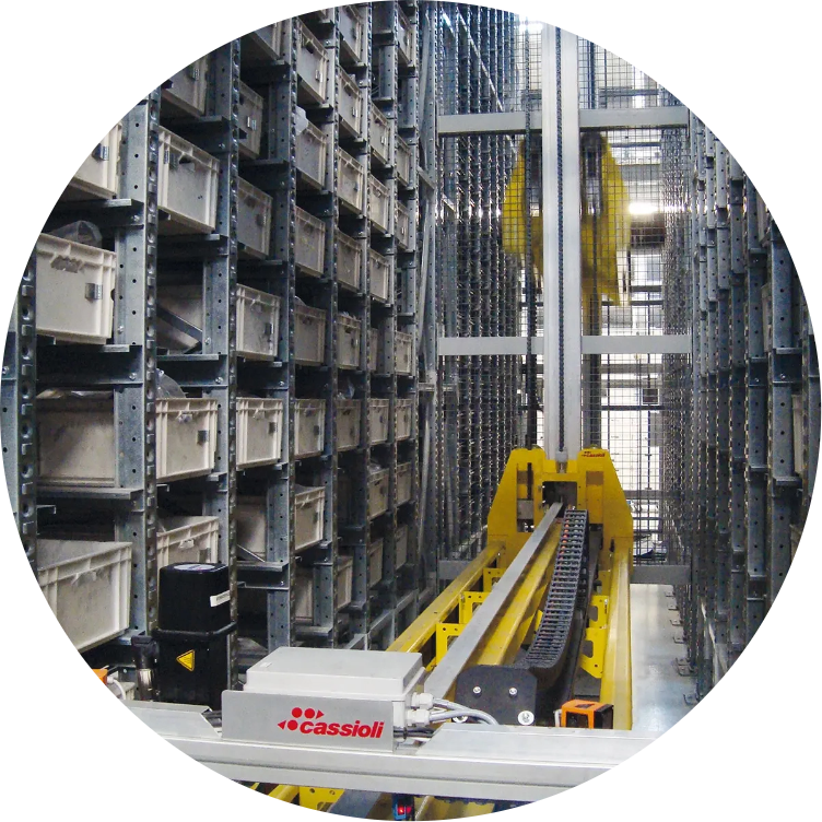 The CARTESIO automated warehouse for plastic containers offers high density storage with low surface area. The Cartesio system is primarily aimed at the storage of small objects subject to significant picking or placing activity (trays, boxes and drawers). The warehouse is made up of shelving organized into columns, which can also be configured two deep in order to double the capacity of the system. By utilizing multiple storage columns, the CARTESIO system is modular and can be customized for optimal use of available space. The wide range of containers that can be used, together with the modular architecture of the system, makes CARTESIO an intensive warehouse suitable for any industrial environment, including mechanical, pharmaceutical, electrical, hydraulic, fashion sectors and many more. The heart of the CARTESIO warehouse is represented by a beam that moves vertically, equipped with an automatic container extractor (fork, finger or pronged), which moves horizontally. The CARTESIO warehouse is fully lined and is not therefore accessible to operators: this guarantees a reduction in the risk of accidents and greater safety for personnel, as well as less physical damage to materials and zero risk of goods being stolen.