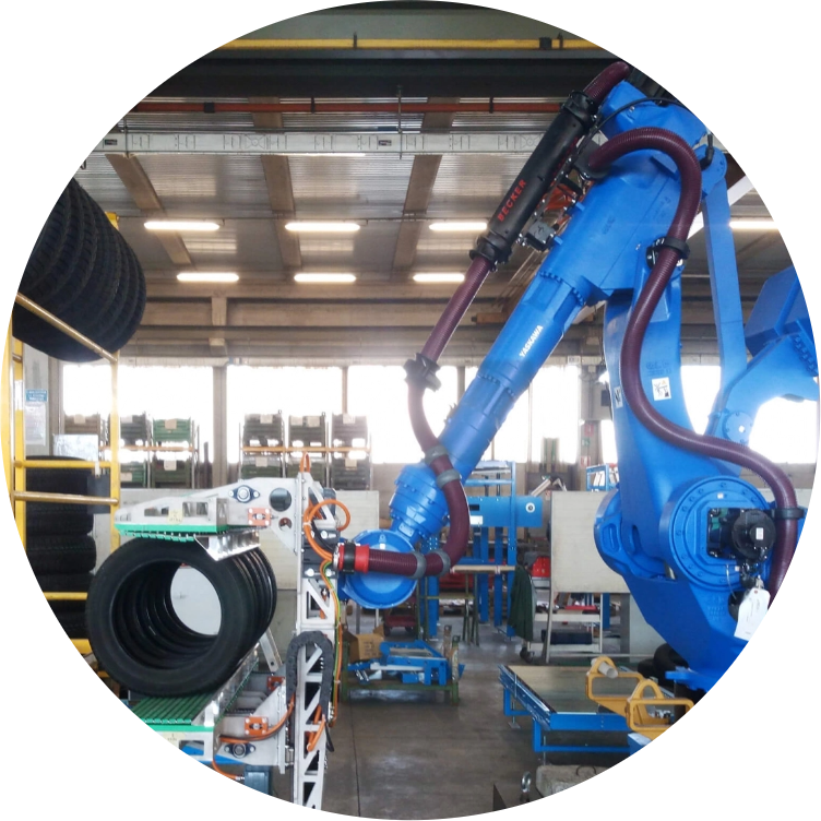 Cassioli’s anthropomorphic palletizer robots are the central element of tire palletizing cells. Each palletizing cell is equipped with a 6-axis anthropomorphic robot capable of loading two pallet stations, so while the robot is loading one pallet, an operator can pick up the other complete pallet and reposition another empty one.