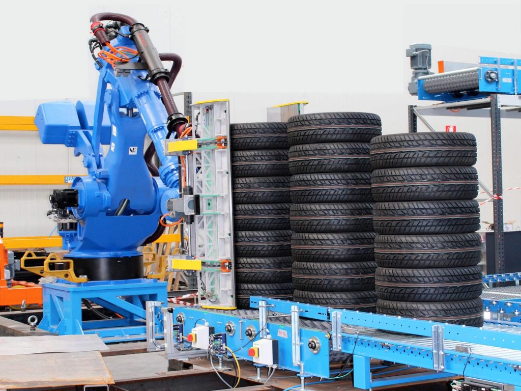 The robot is equipped with a double gripper, allowing it to pick up and position two tires (of the same type) per cycle.
