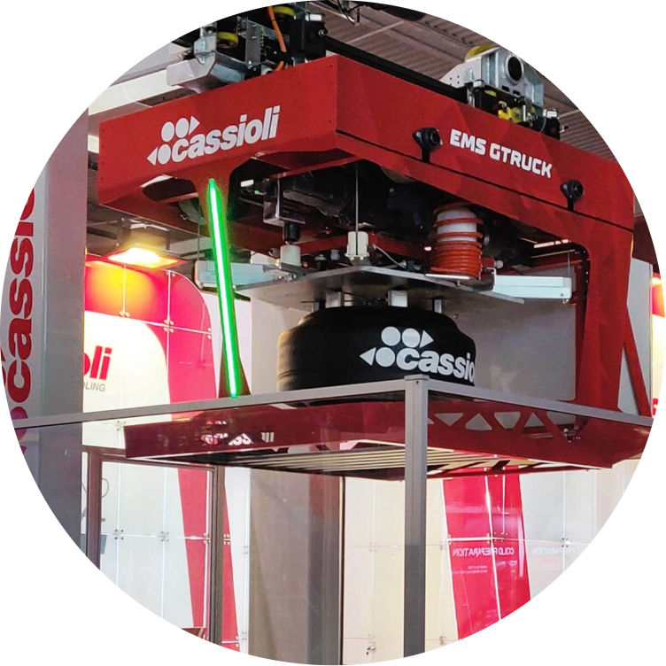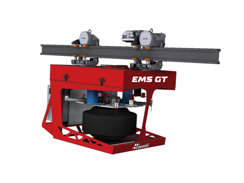 The new special aluminium rail concept allows the Cassioli EMS to guarantee high performance while maintaining excellent reliability and stability of the entire system. The shuttle can handle various tire sizes and interface with different types of presses completely automatically.