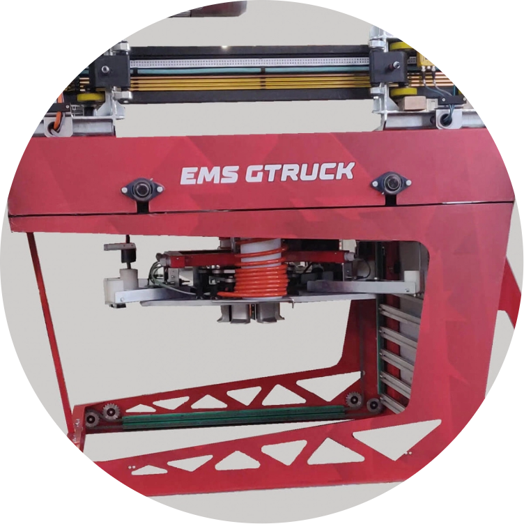 The EMS is a monorail transfer system for handling green tires in tire production plants, running along an overhead rail. The EMS is usually used to ensure a continuous flow of green tires from the TBM (Tire Building Machine) to a buffer and from the buffer to the curing presses.