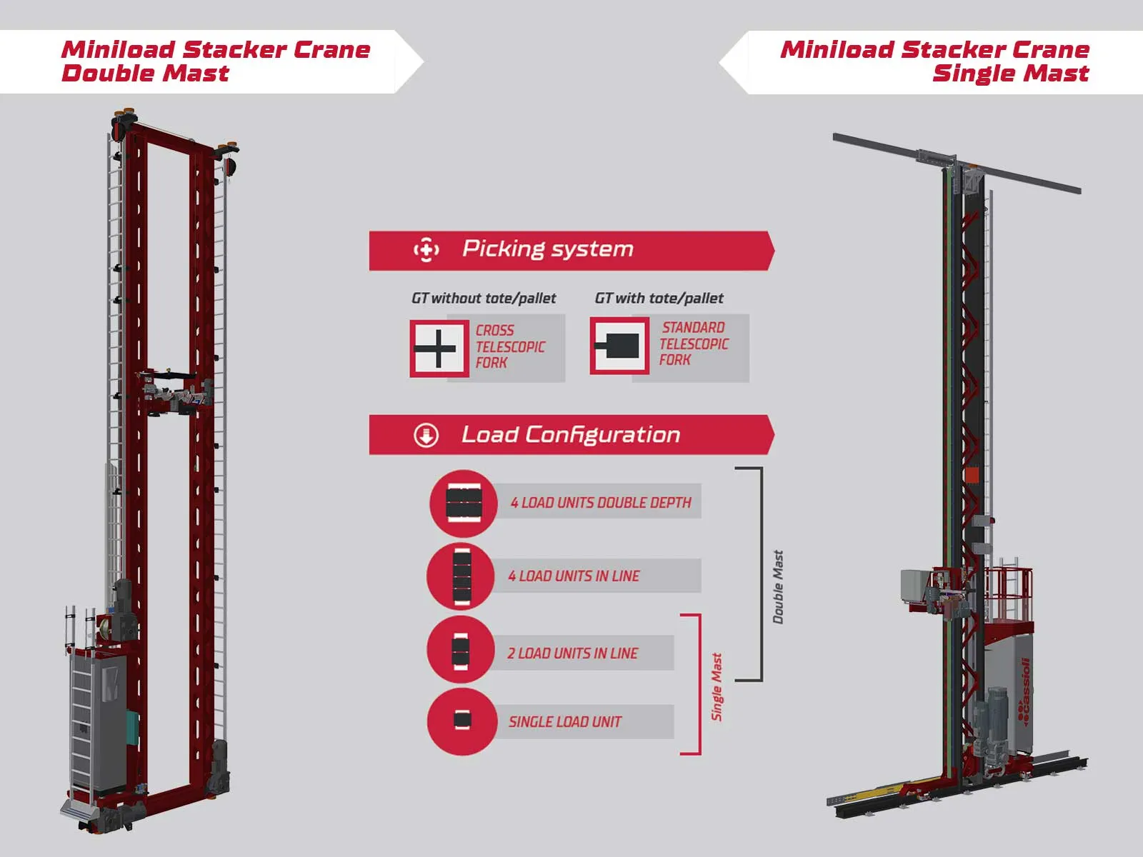 To meet various flow and logical requirements of serving the presses, Cassioli designed two types of stacker cranes: single and double mast. Different loading configurations are available for each of them.